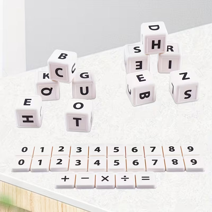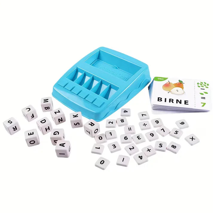 The Educational 2-in-1 Math & Word Matching Game helps children learn spelling and simple arithmetic using matching cards, letter cubes, numbers, and symbol blocks for interactive learning 🧠✨.
